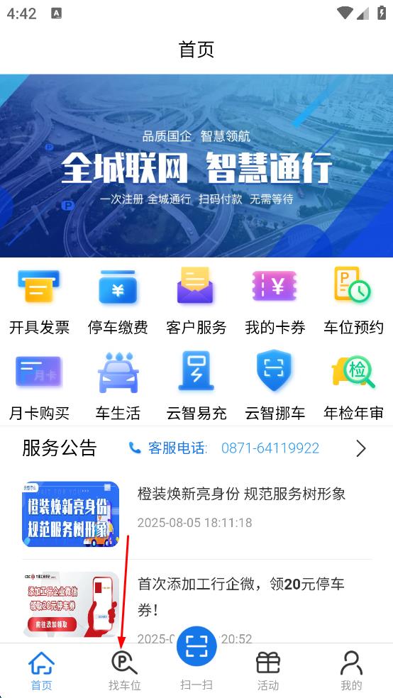 1、打開智慧通行APP,在首頁點(diǎn)擊找車位功能,進(jìn)入找車位頁面,地圖會顯示當(dāng)前位置及周邊區(qū)域。