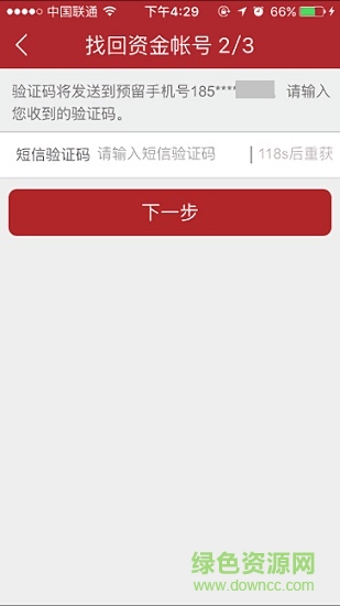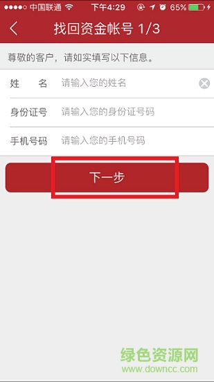2.進(jìn)入找回資金界面,輸入需要找回帳戶的對(duì)應(yīng)姓名、身份證號(hào)、手機(jī)號(hào)碼,點(diǎn)擊【下一步】按鈕