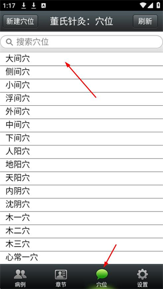 3、在穴位頁面,設(shè)有搜索框,用戶能夠輸入穴位名稱,快速定位大間穴、側(cè)間穴等董氏針灸穴位,了解穴位的相關(guān)信息,如位置、主治病癥等。