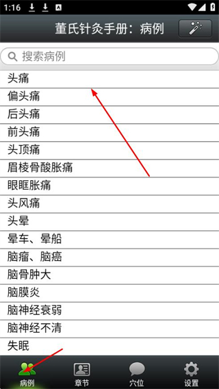 1、在病例頁面,用戶可以通過搜索框輸入病癥名稱,快速查找如頭痛、失眠等各類病癥的針灸治療病例,獲取相應(yīng)的治療方案參考。