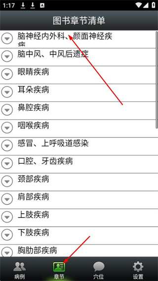 2、點擊章節(jié)進入圖書章節(jié)清單,涵蓋腦神經(jīng)內(nèi)科疾病、眼睛疾病、四肢疾病等多個類別,方便用戶系統(tǒng)地查閱不同疾病類型的董氏針灸治療內(nèi)容。