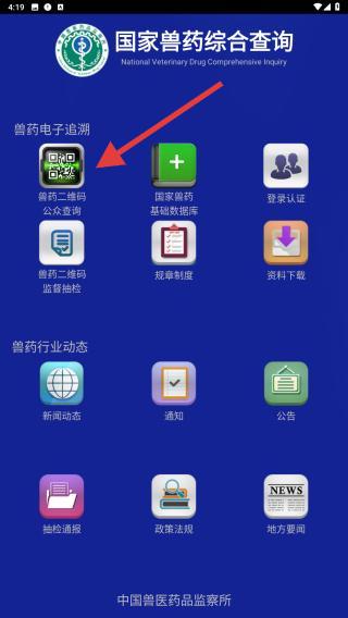 1、在手機(jī)桌面找到國(guó)家獸藥綜合查詢(xún)的圖標(biāo),認(rèn)準(zhǔn)中國(guó)獸醫(yī)藥品監(jiān)察所開(kāi)發(fā)標(biāo)識(shí),點(diǎn)擊進(jìn)入首頁(yè)。