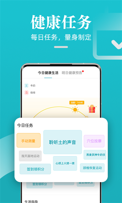 -用戶通過一鍵測(cè)試可檢查自身的臟腑狀態(tài)和心率等身體參數(shù)
