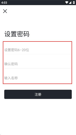 4、在設(shè)置密碼頁面填寫6-20位的密碼、確認密碼及名稱,點擊注冊完成操作。