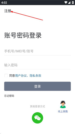 1、打開該軟件進入賬號密碼登錄頁面,點擊左上角注冊選項,跳轉(zhuǎn)至新用戶注冊界面。