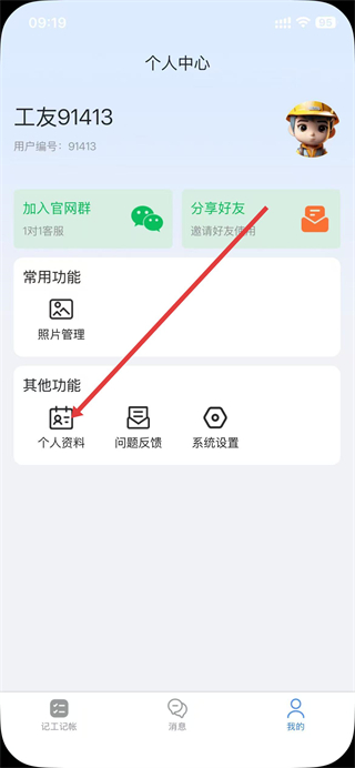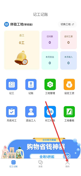 1、打開(kāi)記工記賬app,點(diǎn)擊底部導(dǎo)航欄最右側(cè)我的選項(xiàng)。
