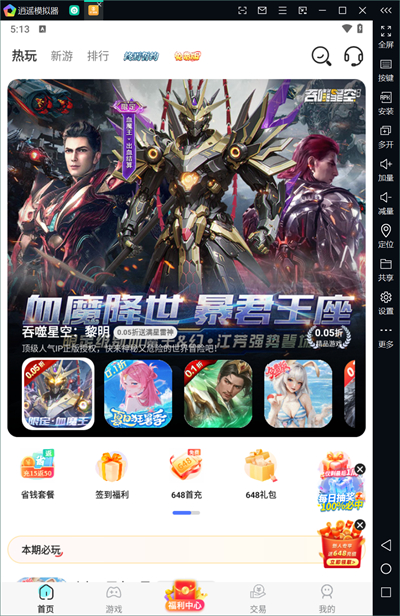 1、打開(kāi)游戲盒子后,在首頁(yè)的位置可以查看推薦的手游,可以選擇自己感興趣的游戲下載體驗(yàn);