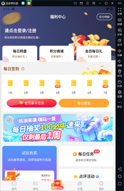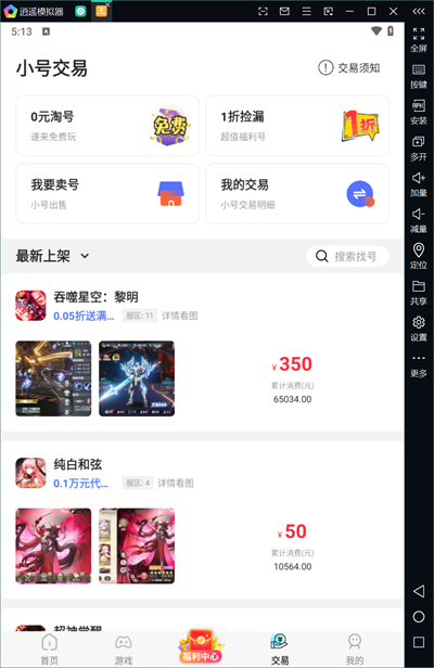 3、點(diǎn)擊下方的交易進(jìn)入交易功能界面,在這里可以將自己不玩的小號(hào)進(jìn)行出售,官方保證交易安全,玩家可以放心出售;
