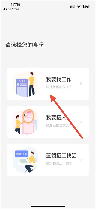 1、在597直聘app身份頁(yè)面,根據(jù)個(gè)人需求選擇注冊(cè)的賬號(hào)類型。