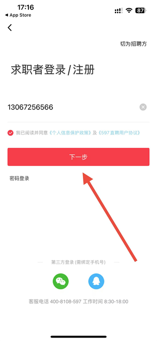 2、在求職者登錄注冊(cè)頁(yè)面輸入手機(jī)號(hào),勾選同意相關(guān)協(xié)議后點(diǎn)擊下一步按鈕。