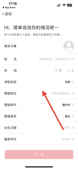 4、在個(gè)人信息完善頁(yè)面填寫(xiě)真實(shí)頭像、姓名、性別等信息,點(diǎn)擊下一步按鈕,即可完成賬號(hào)注冊(cè)操作。