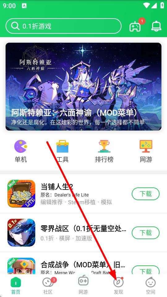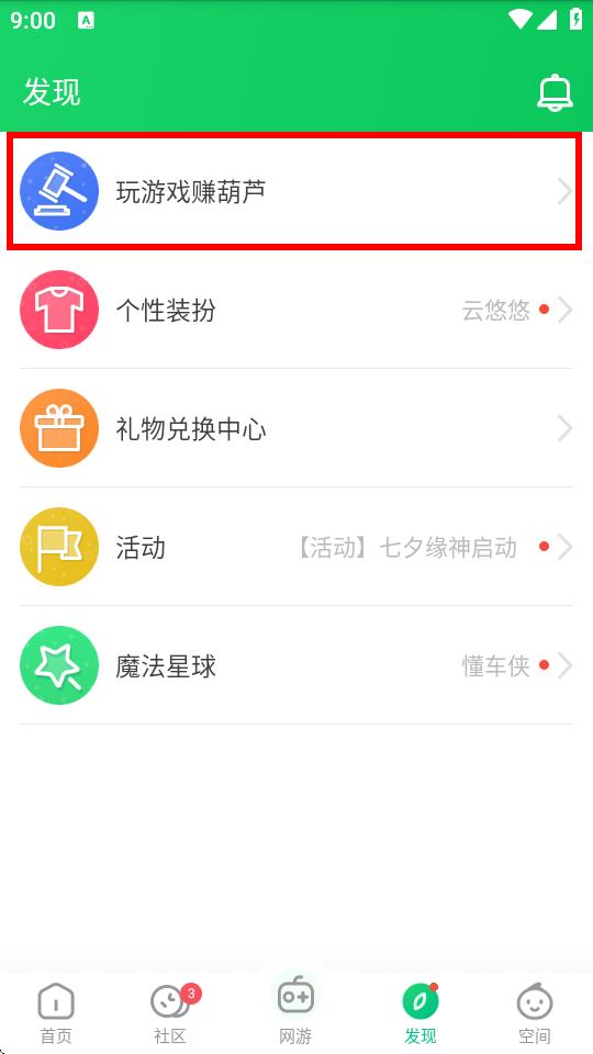 2、在發(fā)現(xiàn)界面中,找到玩游戲賺葫蘆選項并點擊進入。