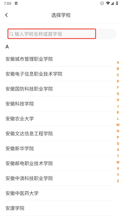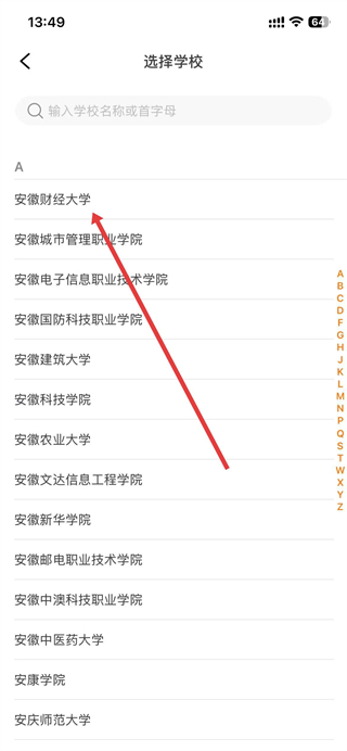 2、為了方便大家能夠快速的找到自己的學校,在這里可以通過輸入學校的名稱和字母快速找尋;