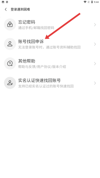 2、在登錄遇到困難頁(yè)面選擇賬號(hào)找回申訴選項(xiàng),借助賬號(hào)資料輔助找回?zé)o法登錄的賬號(hào)。