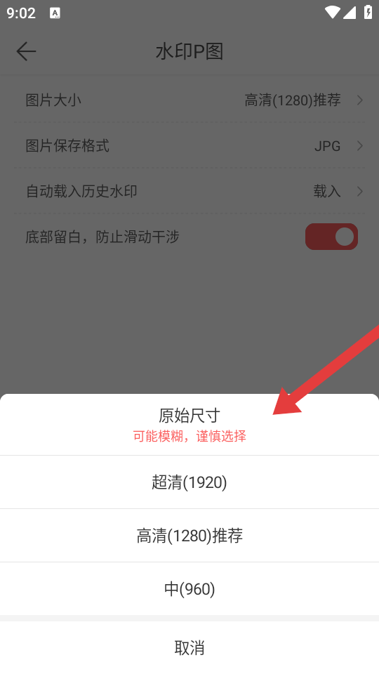 3、在水印P圖設(shè)置頁面,點擊圖片大小選項,彈出圖片尺寸選擇列表。