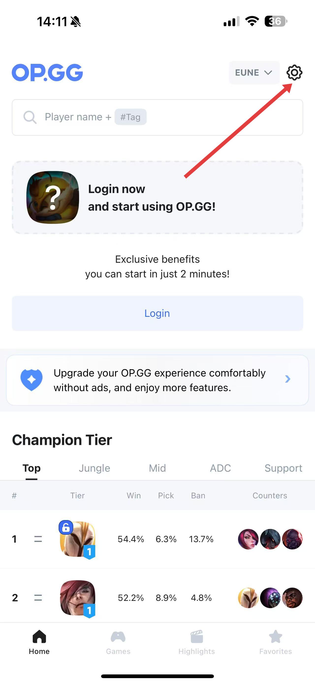 1、打開OP.GG應(yīng)用,在主界面點(diǎn)擊右上角的設(shè)置圖標(biāo)齒輪形狀,進(jìn)入設(shè)置頁面。