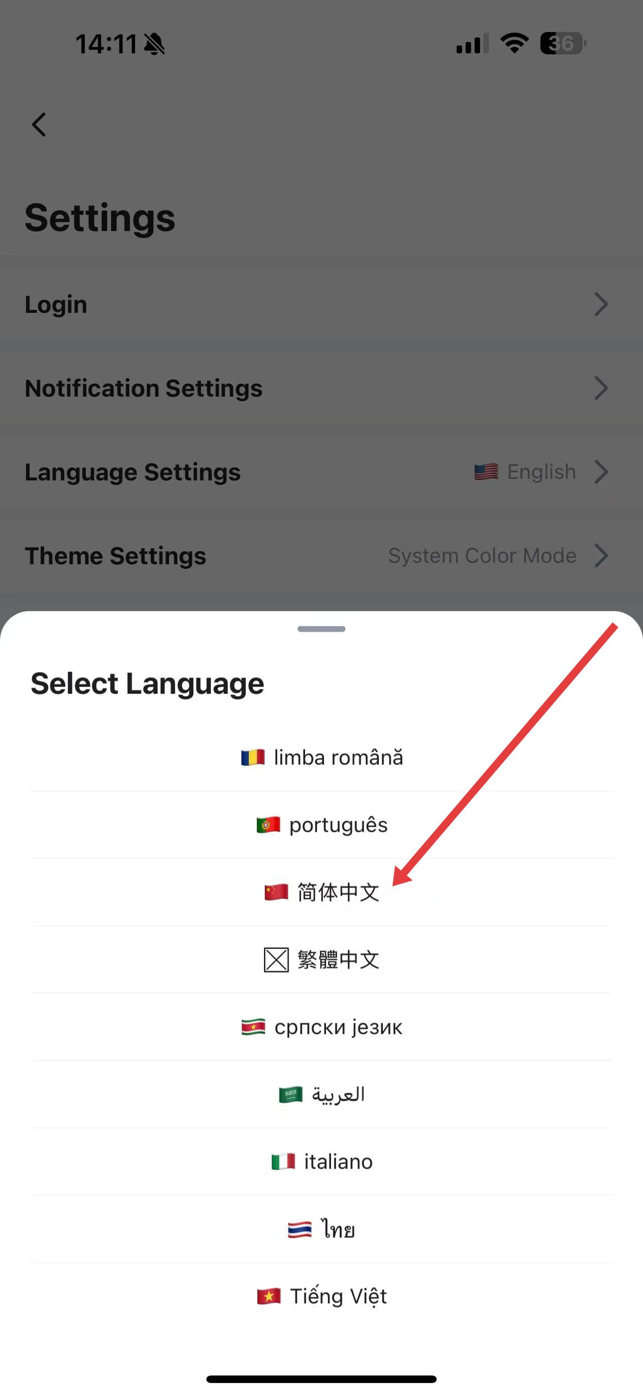 3、在彈出的Select Language選擇語言列表里,找到并點(diǎn)擊簡(jiǎn)體中文選項(xiàng),即可將OP.GG應(yīng)用界面語言切換為中文。