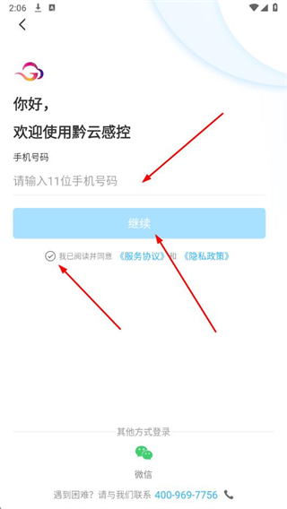 1、打開(kāi)黔云感控APP,在注冊(cè)頁(yè)面輸入手機(jī)號(hào)碼,勾選同意服務(wù)協(xié)議和隱私政策,點(diǎn)擊繼續(xù)按鈕。