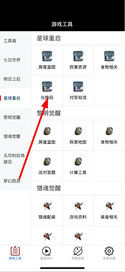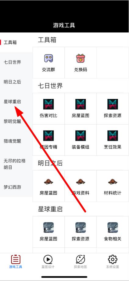 2、在游戲工具頁(yè)面左側(cè)的列表中,找到并點(diǎn)擊星球重啟。