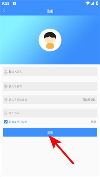 1、打開好鵬友APP,需要在登錄頁(yè)面點(diǎn)擊注冊(cè)的這個(gè)選項(xiàng)。