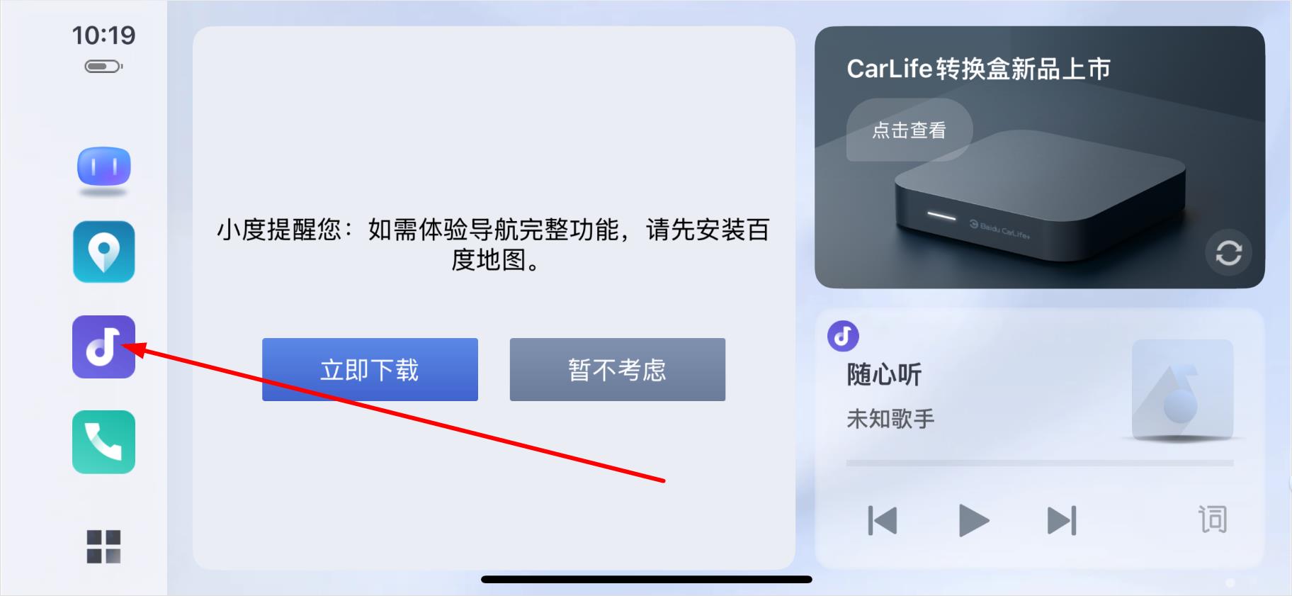 1、打開(kāi)百度carlife應(yīng)用,進(jìn)入主界面后點(diǎn)擊左側(cè)列表中的音樂(lè)圖標(biāo)。