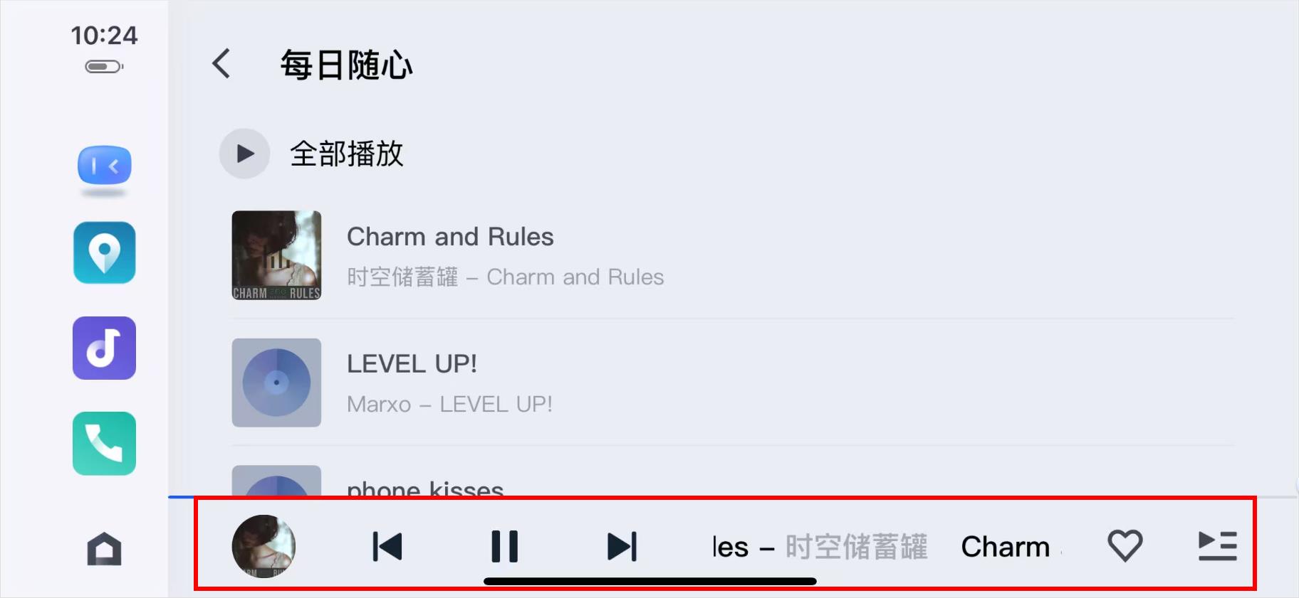 4、點(diǎn)擊后,歌曲開(kāi)始播放,在界面底部會(huì)出現(xiàn)播放控制欄,可進(jìn)行暫停、播放、切換歌曲等操作。