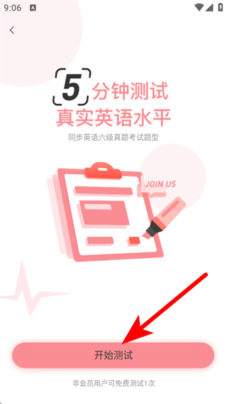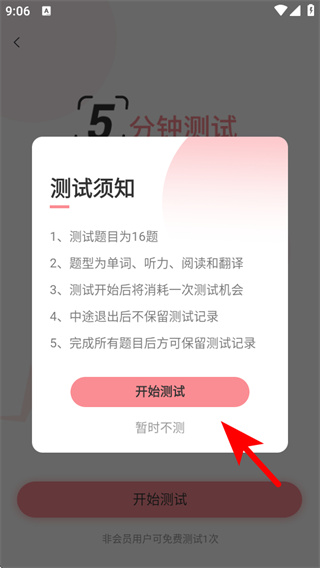 4、在測試須知的彈窗中,點擊開始測試,啟動英語水平測試。