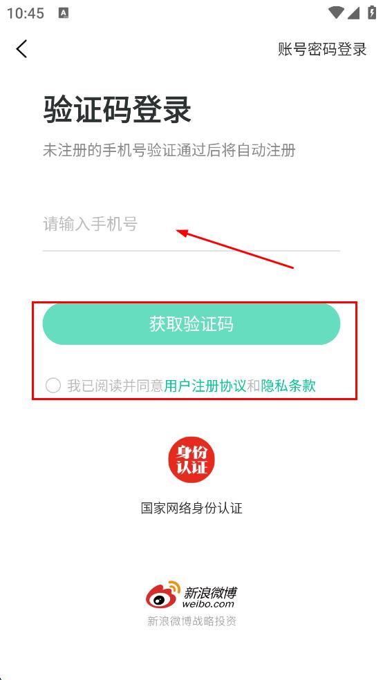 3、在登錄選擇頁面,進(jìn)入驗(yàn)證碼登錄界面,輸入手機(jī)號(hào),閱讀同意協(xié)議,然后點(diǎn)擊“獲取驗(yàn)證碼”。