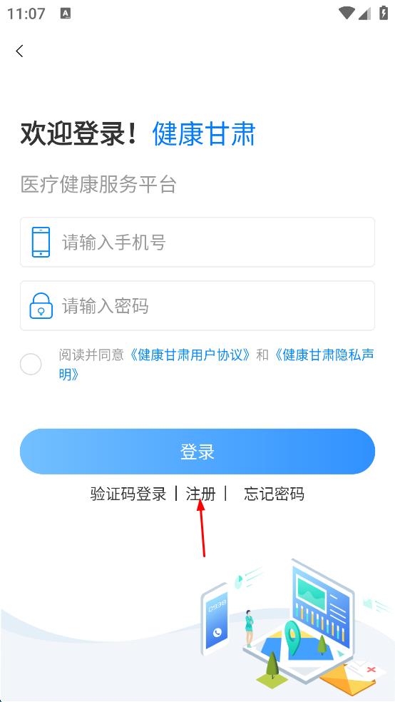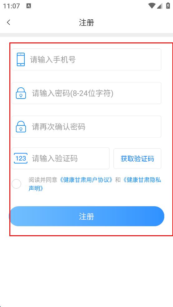 4、輸入完所有信息后,勾選“閱讀并同意健康甘肅用戶協(xié)議和健康甘肅隱私聲明,最后點擊“注冊”按鈕,完成注冊操作。