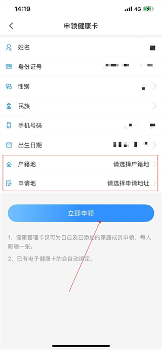 4、填寫戶籍地、申請地等信息后,點擊立即申領。