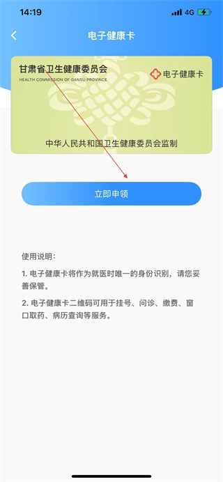 3、在電子健康卡頁面點擊立即申領,進入申領健康卡頁面。