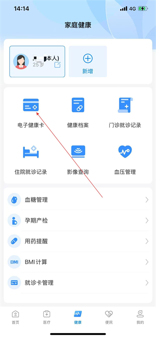 2、在家庭健康頁面點擊電子健康卡,進入電子健康卡頁面。