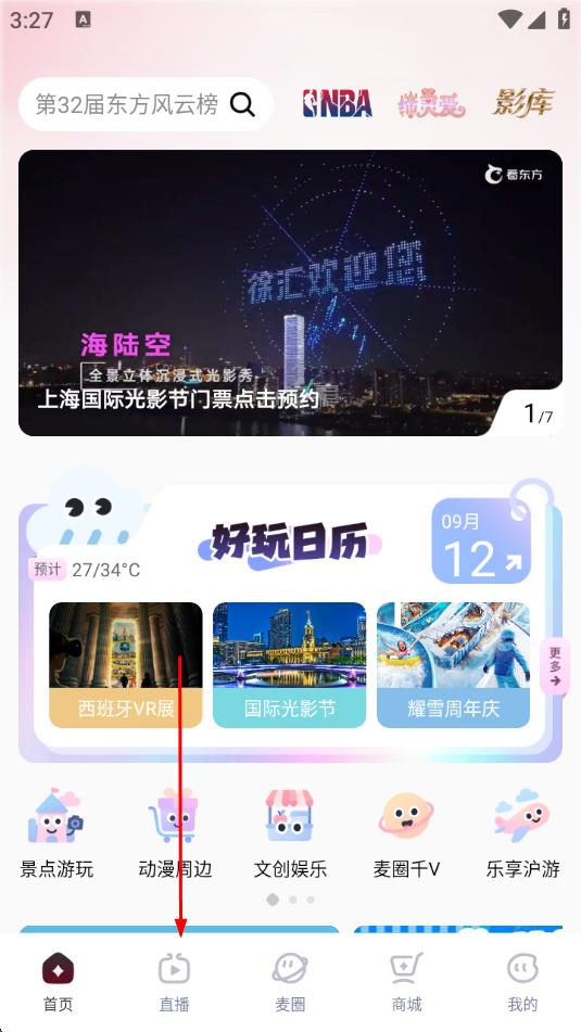 1、打開看東方應用,點擊底部導航欄中的直播選項。