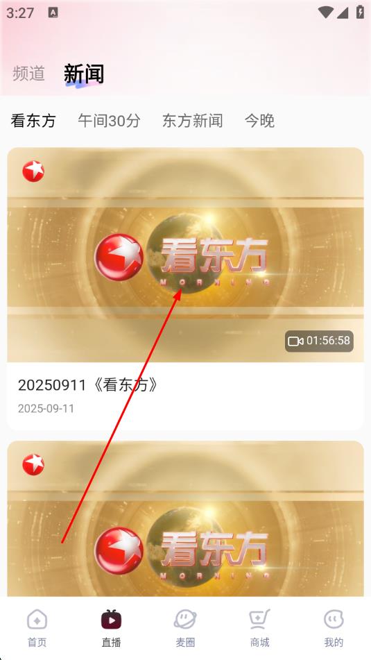 3、在新聞欄目下,找到看東方節(jié)目,點擊想要觀看的回放視頻封面。