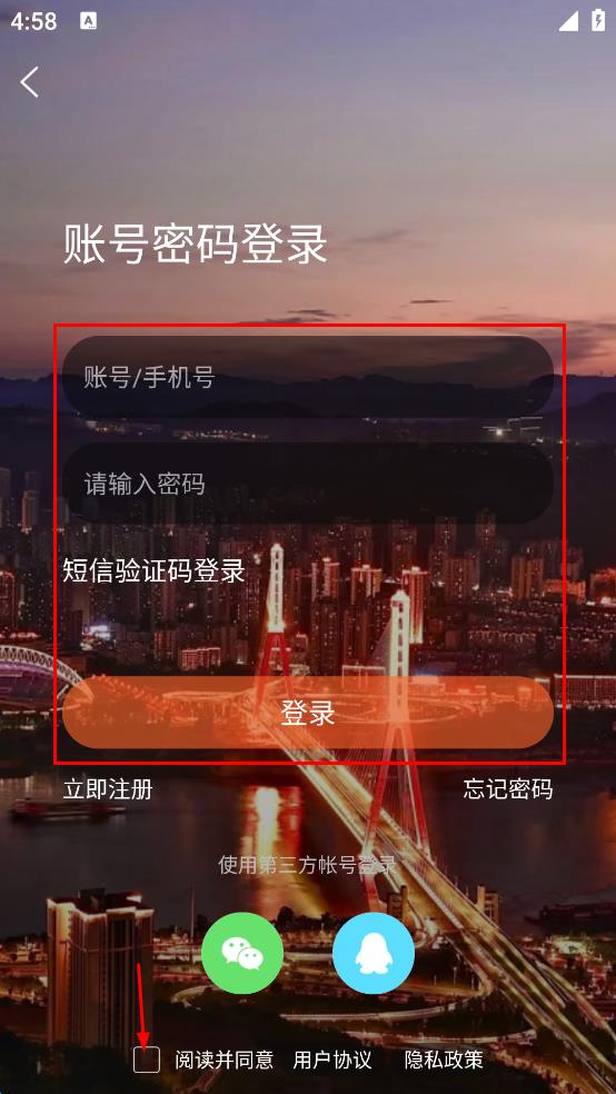 4、在帳號(hào)密碼登錄界面,勾選“閱讀并同意用戶協(xié)議、隱私政策”,輸入賬號(hào)/手機(jī)號(hào)和密碼,點(diǎn)擊“登錄”即可。