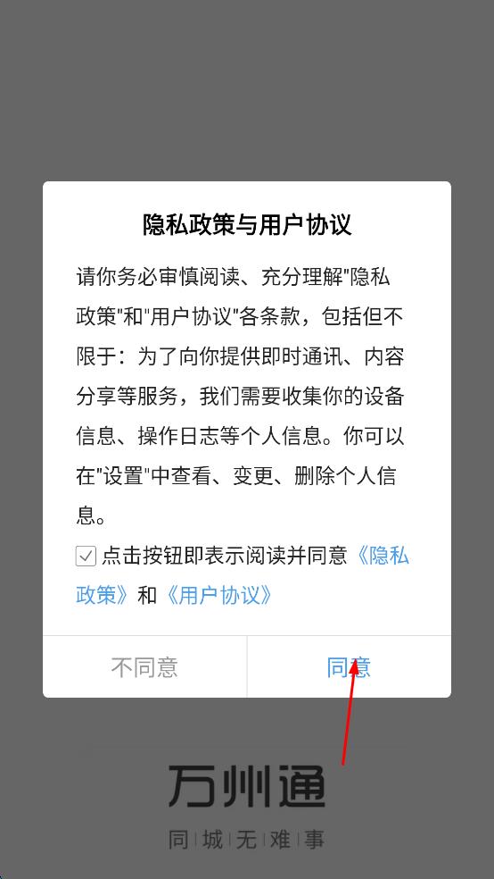 1、打開萬州通,在隱私政策與用戶協(xié)議提示框中,點(diǎn)擊“同意”,進(jìn)入萬州通主界面。