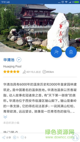 又因,此處以溫泉為特征,所以又稱華清池,這一名稱沿用至今。 功能: 導(dǎo)游-步行和行車導(dǎo)游雙模式隨您選擇,通過GPS定位為您精 準(zhǔn)播報每個景點的歷史文化和內(nèi)涵