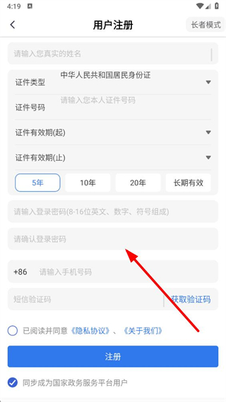 4、在用戶注冊頁面,依次填寫信息,設(shè)置登錄密碼并輸入手機(jī)號獲取驗(yàn)證碼,勾選協(xié)議后點(diǎn)擊注冊完成賬號注冊。