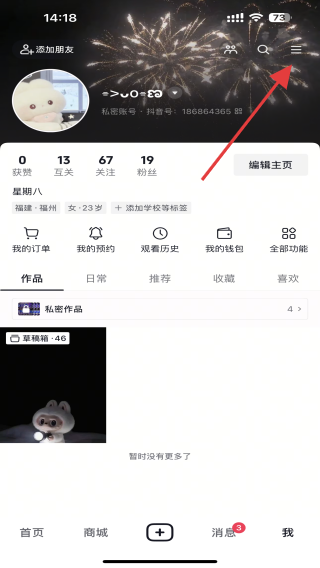 1、打開抖音APP,點擊我進入個人主頁,再點擊右上角三個橫線的圖標(biāo)。