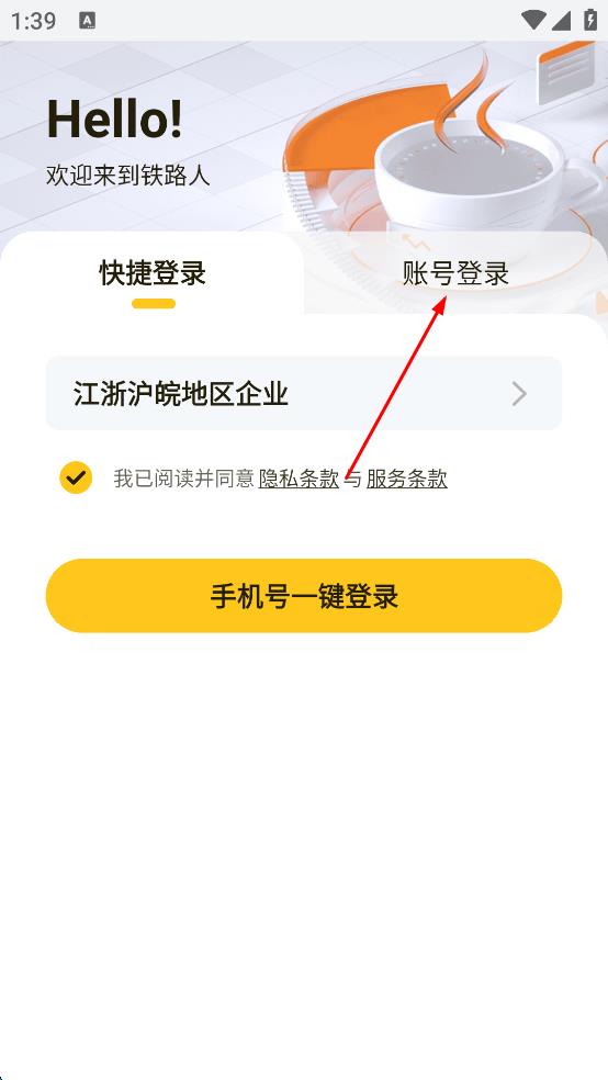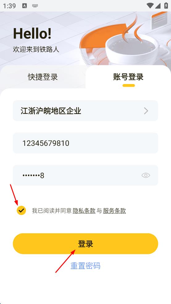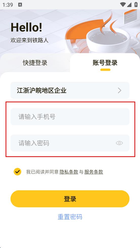 4、填寫好手機(jī)號(hào)和密碼后,勾選“我已閱讀并同意隱私條款與服務(wù)條款”選項(xiàng),然后點(diǎn)擊“登錄”按鈕,即可嘗試登錄鐵路人app。