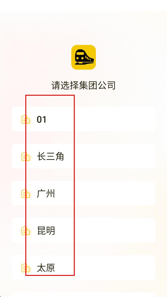 1、打開(kāi)鐵路人app,首先會(huì)進(jìn)入選擇集團(tuán)公司的頁(yè)面,根據(jù)自身情況,選擇對(duì)應(yīng)的集團(tuán)公司,比如可選擇“長(zhǎng)三角”等選項(xiàng)。