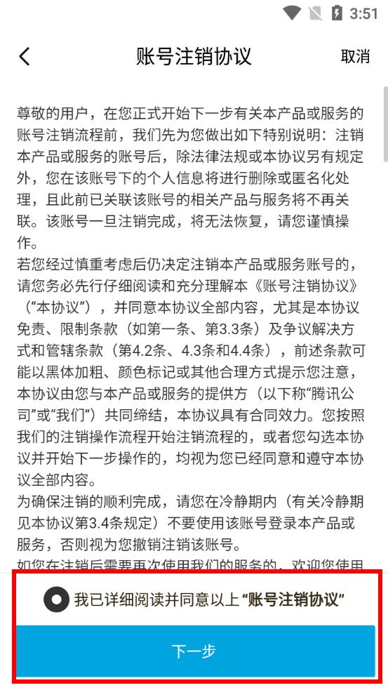 4、仔細(xì)閱讀賬號(hào)注銷協(xié)議,閱讀完畢后勾選賬號(hào)注銷協(xié)議,再點(diǎn)擊下一步,按照后續(xù)提示完成賬號(hào)注銷操作。