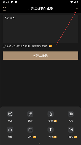 1、打開小料二維碼生成器應(yīng)用,點(diǎn)擊界面右上角的掃描圖標(biāo),進(jìn)入二維碼掃描準(zhǔn)備環(huán)節(jié)。