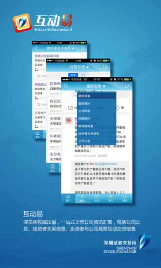 深交所互動(dòng)易iPhone版是一款用戶使用該應(yīng)用可以與上市公司進(jìn)行直接的交流的互動(dòng)易移動(dòng)客戶端。軟件功能強(qiáng)大,同時(shí)還可以瀏覽上市公司的最新問(wèn)答、投資者關(guān)系信息、公司聲音、大事提醒等信息。趕快下載吧??!