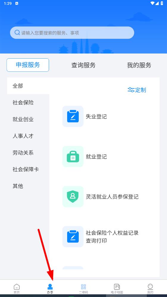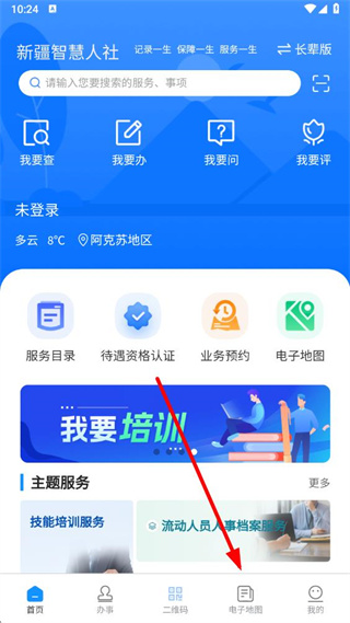 1、打開(kāi)新疆智慧人社app,點(diǎn)擊底部導(dǎo)航欄中的電子地圖選項(xiàng)。