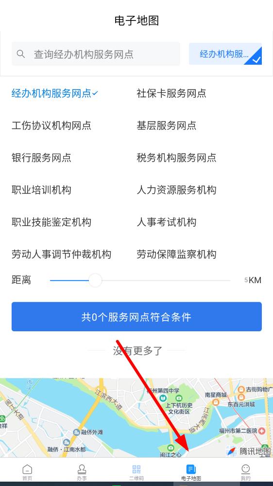 3、點(diǎn)擊底部電子地圖,可查詢(xún)經(jīng)辦機(jī)構(gòu)服務(wù)網(wǎng)點(diǎn)、社保卡服務(wù)網(wǎng)點(diǎn)、工傷協(xié)議機(jī)構(gòu)網(wǎng)點(diǎn)等各類(lèi)與人社服務(wù)相關(guān)的網(wǎng)點(diǎn),推薦附近符合條件的網(wǎng)點(diǎn)地圖導(dǎo)航。