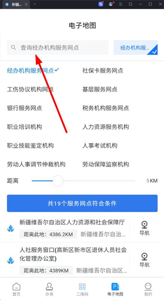 2、在電子地圖頁(yè)面,可在搜索框輸入要查詢(xún)的經(jīng)辦機(jī)構(gòu)服務(wù)網(wǎng)點(diǎn),或選擇相關(guān)機(jī)構(gòu)類(lèi)型。