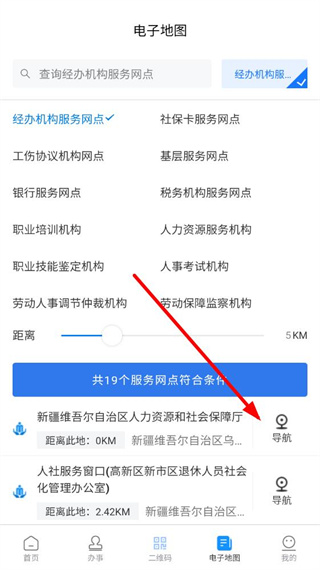 4、選擇好機(jī)構(gòu)類(lèi)型后,點(diǎn)擊符合條件的服務(wù)網(wǎng)點(diǎn)右側(cè)的導(dǎo)航按鈕,即可查詢(xún)附近機(jī)構(gòu)并獲取導(dǎo)航路線。