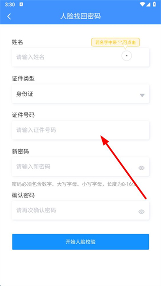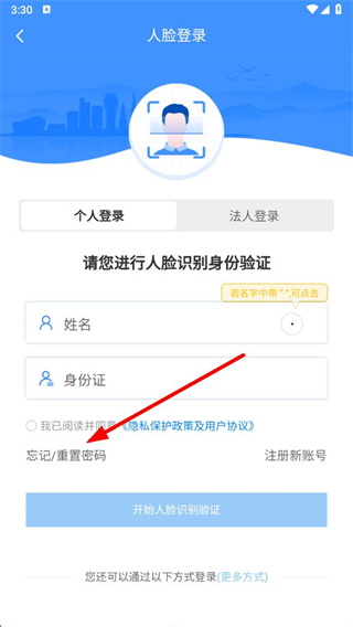 4、若選人臉識(shí)別找回密碼,輸入個(gè)人信息,點(diǎn)擊開(kāi)始人臉校驗(yàn),按提示完成密碼重置。