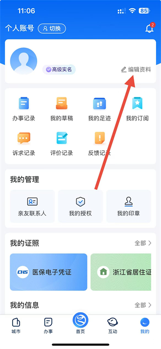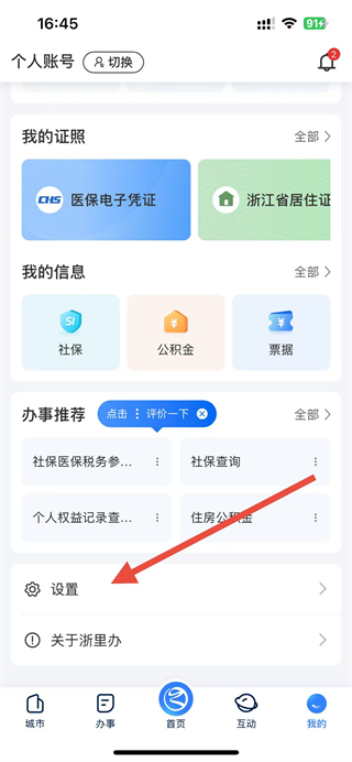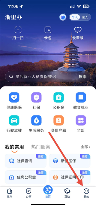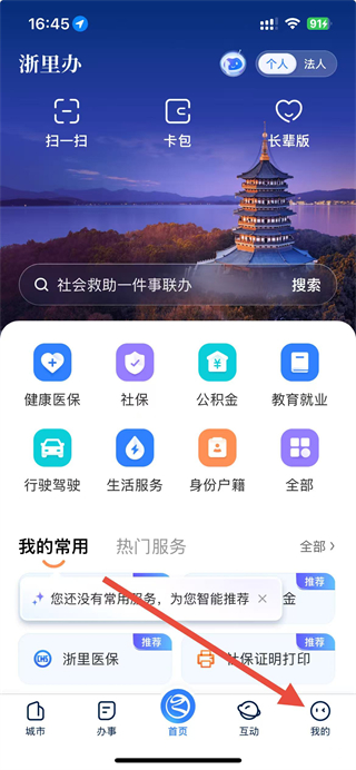 1、打開浙里辦app,點(diǎn)擊右下角我的選項(xiàng),進(jìn)入個(gè)人頁(yè)面。